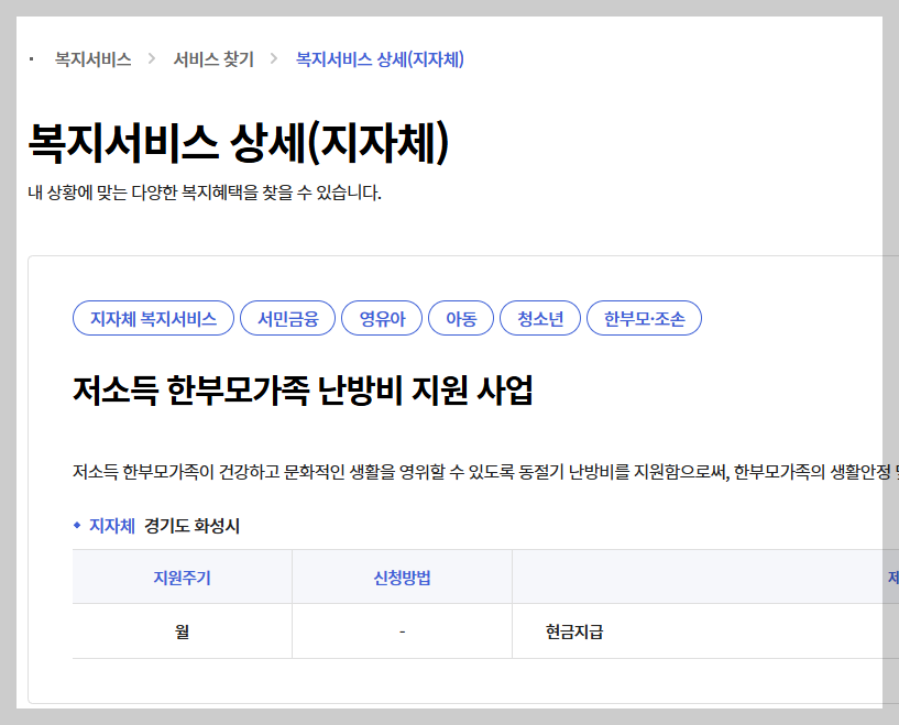 - 기초수급자 외에도, 중위소득 60% 이하 가구를 대상으로 하는 경우도 있으니 해당 시·군·구청 홈페이지에서 반드시 확인해야 합니다.