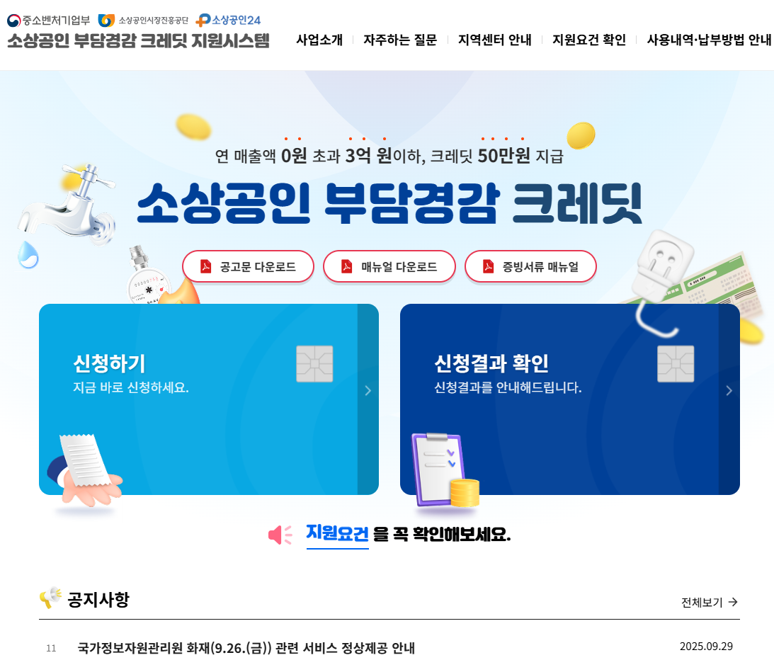 - 부담경감 크레딧 전용 누리집(https://credit.sbiz24.kr)에 접속하거나, 소상공인24(https://www.sbiz.or.kr)에서도 신청 가능