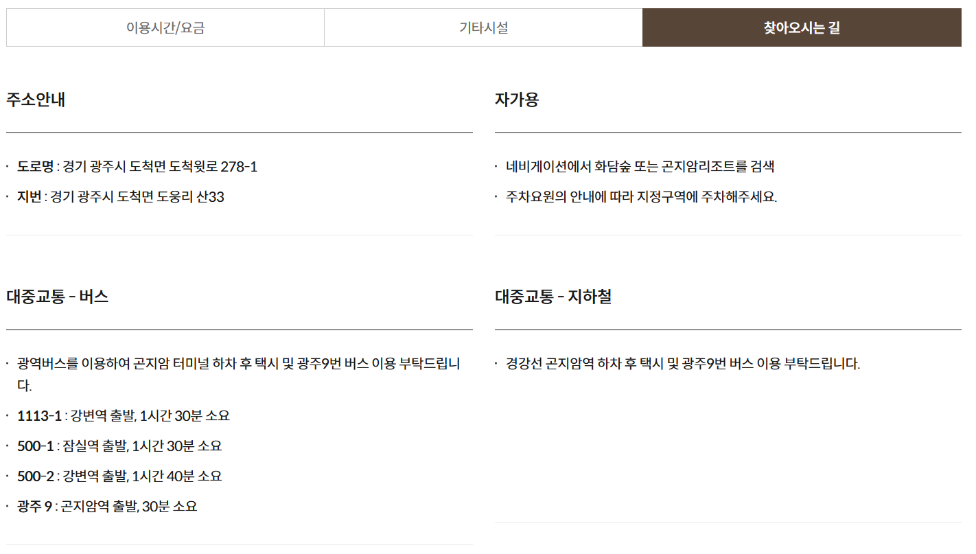 - 경강선 곤지암역 하차 → 2번 출구 → 셔틀버스 or 택시 약 10분