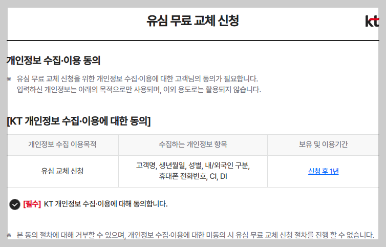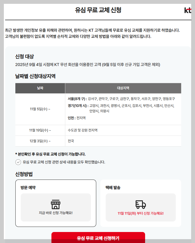 - 대리점 방문 예약: 접수 후 가까운 KT 대리점에서 교체 가능.