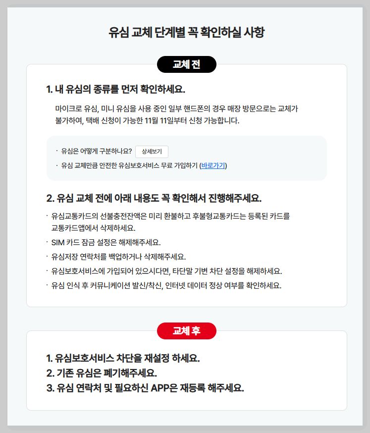 - 교체 시 **기존 유심칩을 반드시 폐기(반납)**해야 하며, 제3자에게 양도하거나 유심칩을 재사용해서는 안 됩니다.