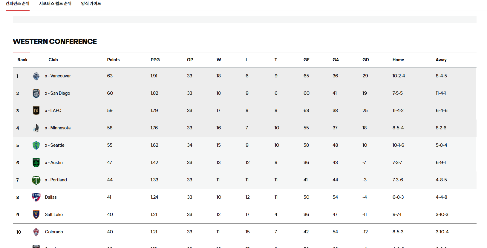 - 상위에는 1위 Vancouver Whitecaps FC, 2위 San Diego FC 등이 위치해 있습니다.